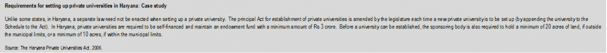 A university must be a trust, society, not for profit entity or should be run by one. There are two routes to establish a private university. Primarily, it may be set up through an Act of Parliament (central university) or an Act of a state legislature (state university). Till date, no private university has been set up through an Act of Parliament. The other route is by being declared a deemed university. Currently, 229 universities are privately managed.[11] States may differ in the land norms and other procedural steps required in setting up a private university. However, an analysis of laws in some states such as Rajasthan, Madhya Pradesh and Gujarat shows that largely these requirements are similar across states.[12] An example of the requirements for setting up a private university in the state of Haryana is provided in the adjacent text box.