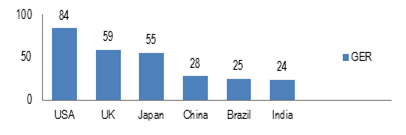 In India, GER in higher education has more than doubled over a period of 11 years, going from 9% in 2002-03 to 24% in 2013-14. The Rashtriya Uchchatar Shiksha Abhiyan is a centrally sponsored scheme launched in 2013, mainly to provide funding to state higher educational institutions. The scheme’s objective is to achieve 30% GER in higher education by 2020. While GER has increased, it reflects that currently only 24% of people who should be enrolled in universities (as per target age-group of 18-24 years) are actually enrolled. This is fairly low compared to other countries such as the UK and USA, as seen in figure 1 below.