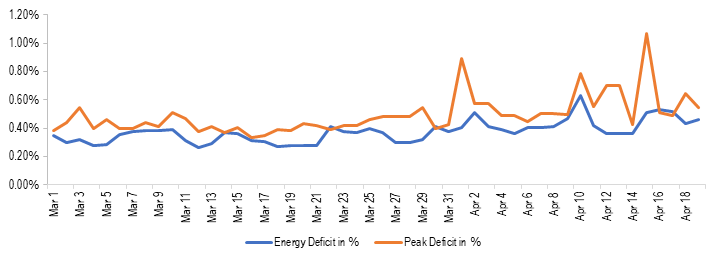 As power sector related operations have been classified as essential services, the plant operations and availability of fuel (primarily coal) have not been significantly constrained. This can be observed with the energy deficit and peak deficit levels during the lockdown period which have remained at a nominal level. Energy deficit indicates the shortfall in energy supply against the demand during the day. The average energy deficit between March 25 and April 19 has been 0.42% while the corresponding figure was 0.33% between March 1 and March 24. Similarly, the average peak deficit between March 25 and April 19 has been 0.56% as compared to 0.41% between March 1 and March 24. Peak deficit indicates the shortfall in supply against demand during highest consumption period in a day.