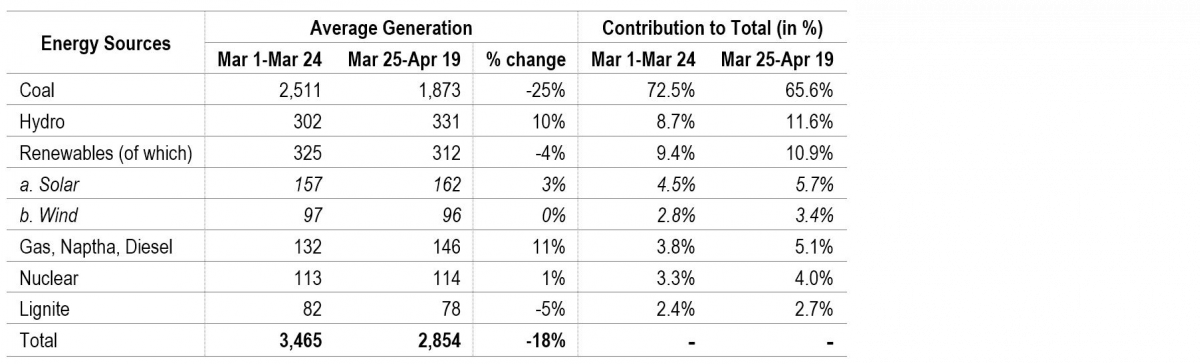 During the lockdown, power generation has been adjusted to compensate for reduced consumption, Most of this reduction in consumption has been adjusted by reduced coal power generation. As can be seen in Table 1, coal power generation reduced from an average of 2,511 MU between March 1 and March 24 to 1,873 MU between March 25 and April 19 (about 25%). As a result, the contribution of coal in total power generation reduced from an average of 72.5% to 65.6% between these two periods.
